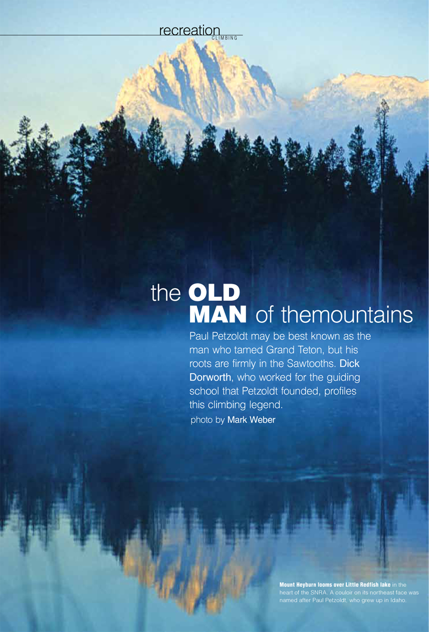 The first time Paul Petzoldt took the responsibility of guiding someone in the Sawtooth Mountains of central Idaho was in 1920. He led a friend and his dog, Ranger, on a tour of the Sawtooths and later wrote of the experience, "Perhaps it was then I realized the mountains and wilderness were indispensable to me."